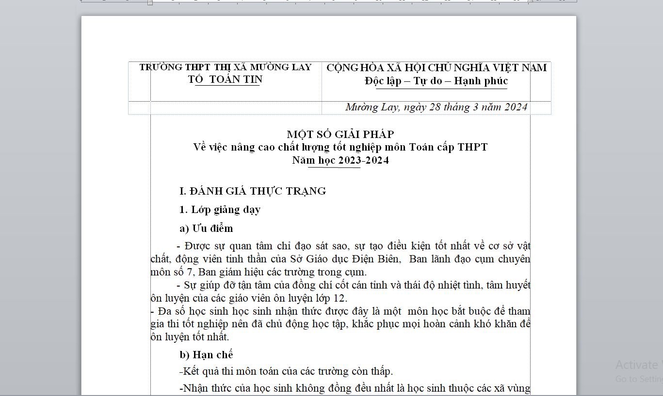 Với mục đích nâng cao chất lượng giảng dạy, đặc biệt là nâng cao chất lượng và hiệu quả ôn thi tốt nghiệp THPT năm 2024, Cô giáo Dương Thị Tâm, giáo viên trường THPT Huyện Mường Chà đã phân tích cấu trúc, nội dung đề thi tốt nghiệp THPT năm 2022, 2023, đề tham khảo của Bộ năm 2024; nhóm đã thực hiện việc giải đề, phân tích đề tham khảo theo cấp độ câu hỏi. Từ đó nhóm đã thống nhất nội dung điều chỉnh ôn thi cho phù hợp với nội dung kiến thức, phù hợp với tình hình thực tế học sinh của cụm.