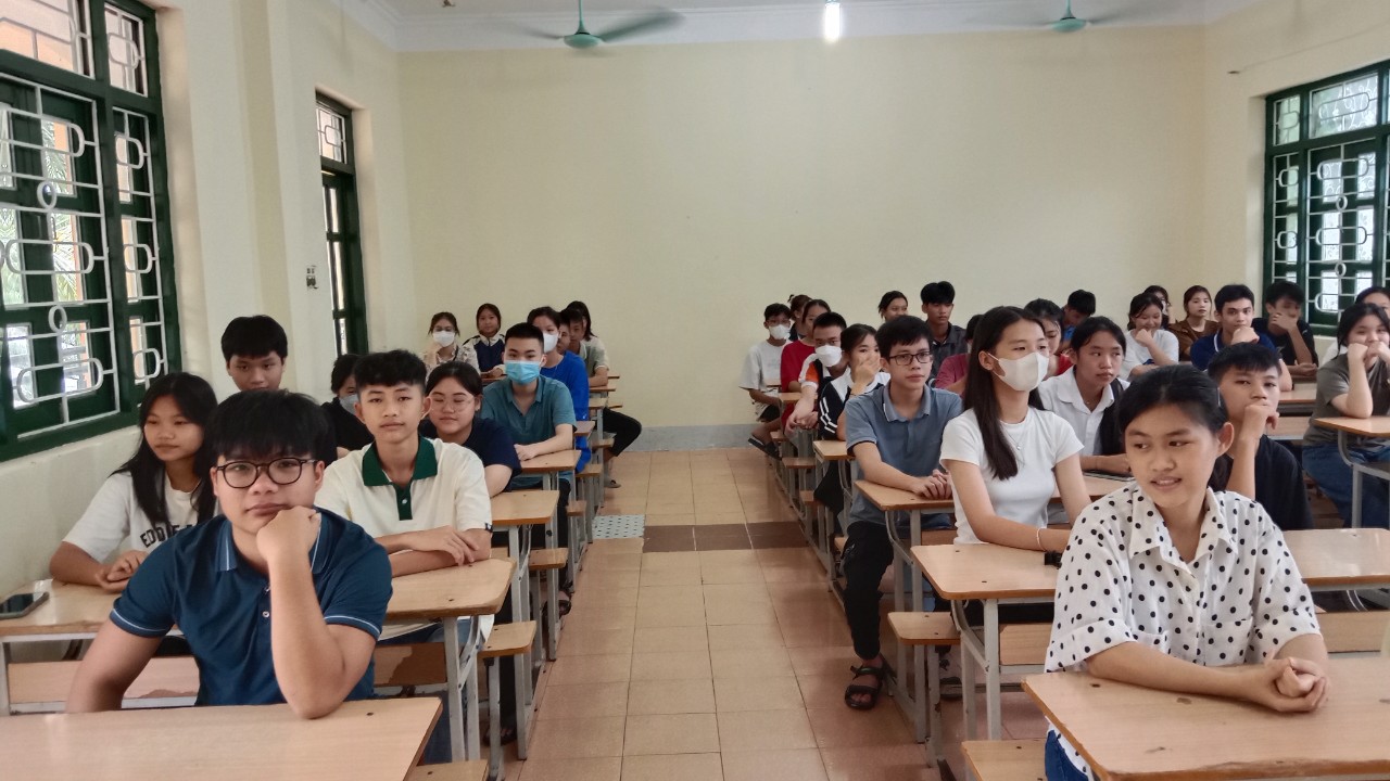 Học sinh lớp 10 tập trung lắng nghe giáo viên hướng dẫn lựa chọn môn học