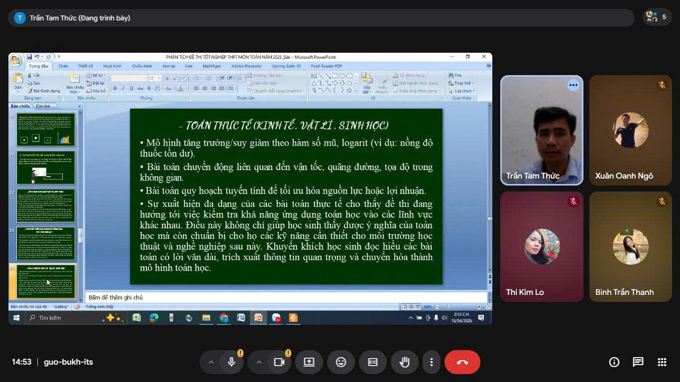 Tại buổi sinh hoạt, các báo cáo viên đã trình bày ba nội dung chuyên đề trọng tâm. Ở chuyên đề thứ nhất, đồng chí Cao Thị Tâm – Trường THPT Na Sang đã tập trung phân tích cấu trúc đề thi tốt nghiệp THPT môn Toán năm 2025, từ đó định hướng xây dựng nội dung ôn thi năm 2026 theo hướng bám sát yêu cầu cần đạt của Chương trình giáo dục phổ thông 2018. Báo cáo nhấn mạnh việc xác định đúng các mạch kiến thức trọng tâm, phân loại mức độ nhận thức và xây dựng lộ trình ôn tập phù hợp với từng nhóm đối tượng học sinh. Cách tiếp cận này giúp giáo viên có thêm cơ sở để tổ chức ôn tập khoa học, tránh dàn trải, đồng thời nâng cao hiệu quả bồi dưỡng ở cả nhóm học sinh trung bình, yếu và nhóm học sinh khá, giỏi.