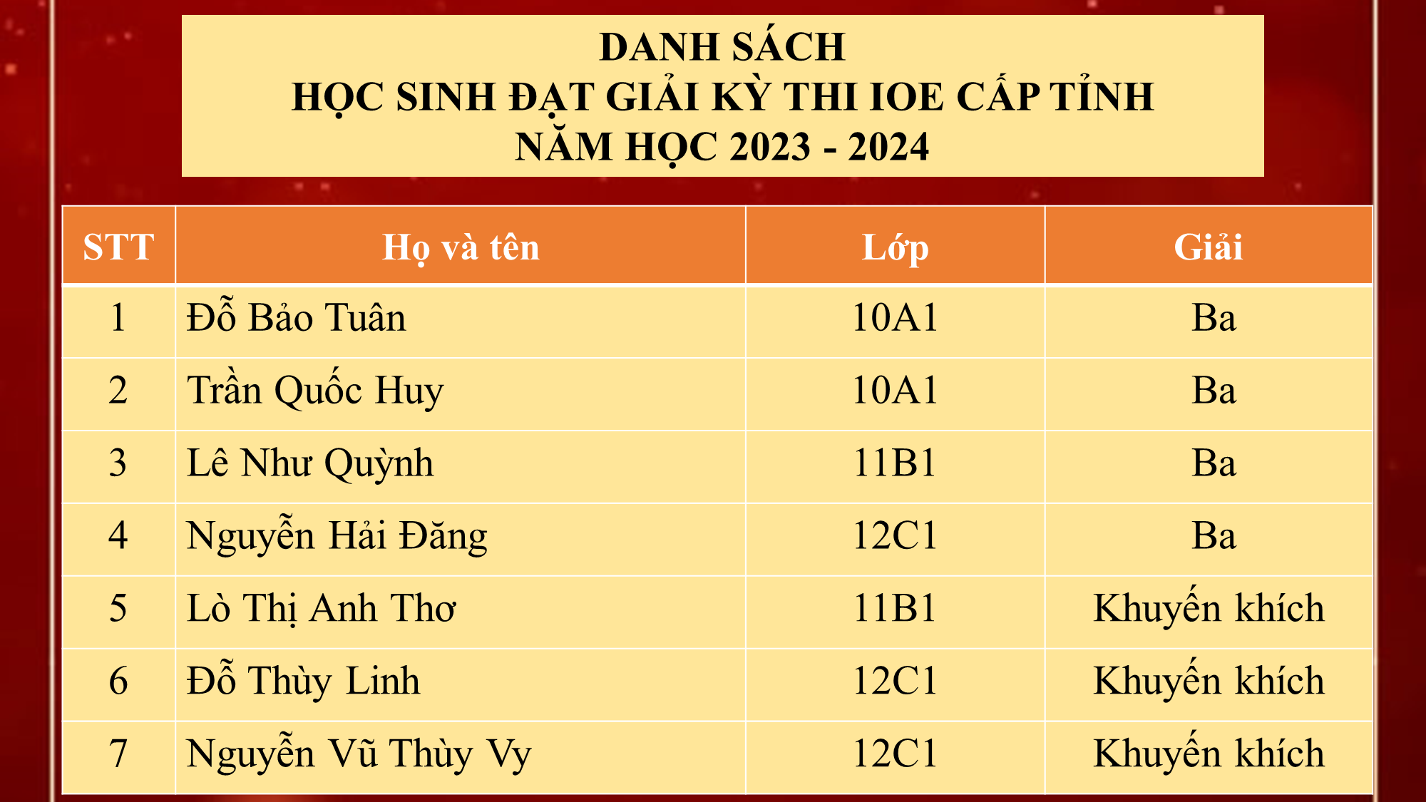 Căn cứ vào kết quả điểm thi của học sinh được ghi nhận trên hệ thống, Ban tổ chức đã công bố danh sách vinh danh chính thức các học sinh đạt thành tích cao trong kỳ thi IOE cấp tỉnh diễn ra từ ngày 29/2 đến ngày 02/3/2024. Trường THPT thị xã Mường Lay có 7/7 học sinh tham gia đều đạt giải, trong đó có 04 giải Ba, 03 giải khuyến khích.