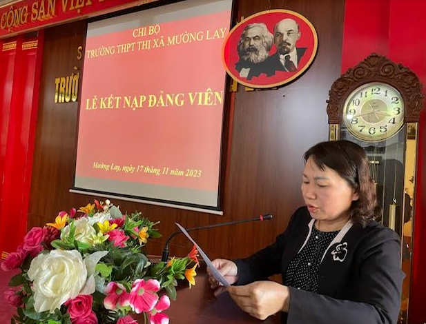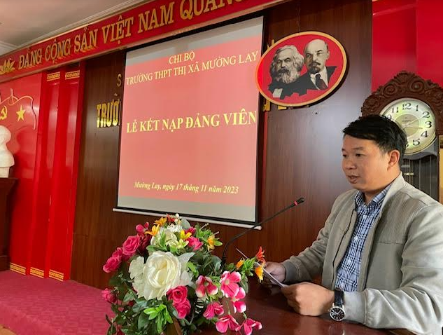 Tại buổi Lễ, đồng chí Nguyễn Văn Hải – Bí thư Chi bộ - Hiệu trưởng nhà trường đã đọc và trao Quyết định kết nạp Đảng cho 02 Đảng viên mới. Đồng chí Nguyễn Văn Hải chúc mừng đồng chí Hoàng Thúy Phượng và Nguyễn Thị Hằng đã được vinh dự đứng vào hàng ngũ của Đảng Cộng sản Việt Nam sau một thời gian được bồi dưỡng, thử thách. Đồng thời, đồng chí cũng bày tỏ mong muốn các đồng chí đảng viên mới kết nạp sẽ tiếp tục giữ gìn phẩm chất đạo đức, nhiệt tình trong công tác, phát huy năng lực hơn nữa để cùng Chi bộ hoàn thành xuất sắc nhiệm vụ, góp phần xây dựng Chi bộ trường THPT Thị xã Mường Lay ngày càng phát triển.