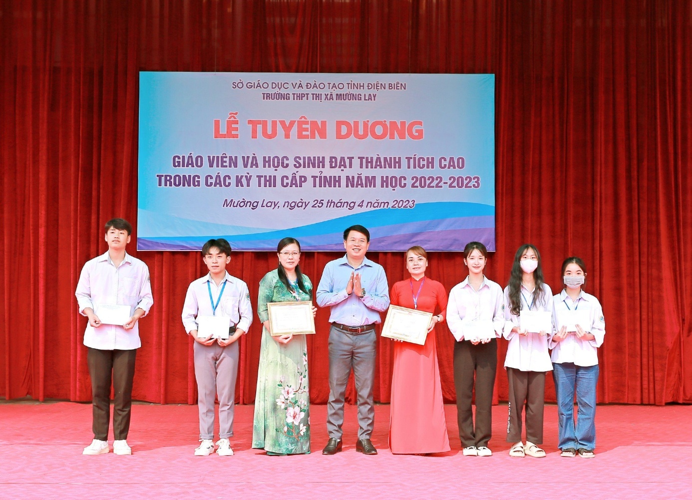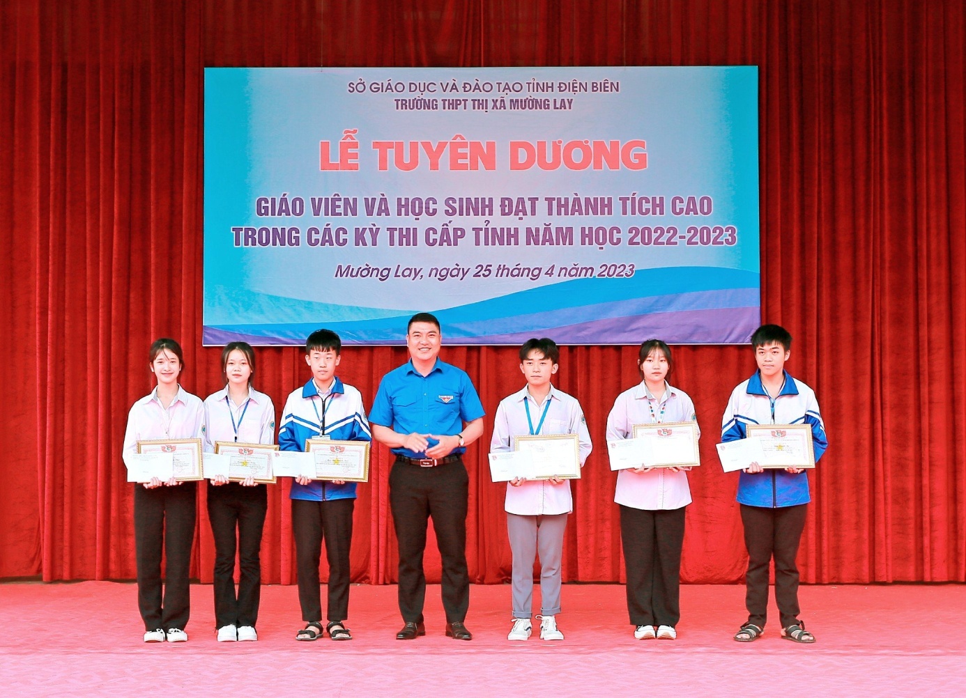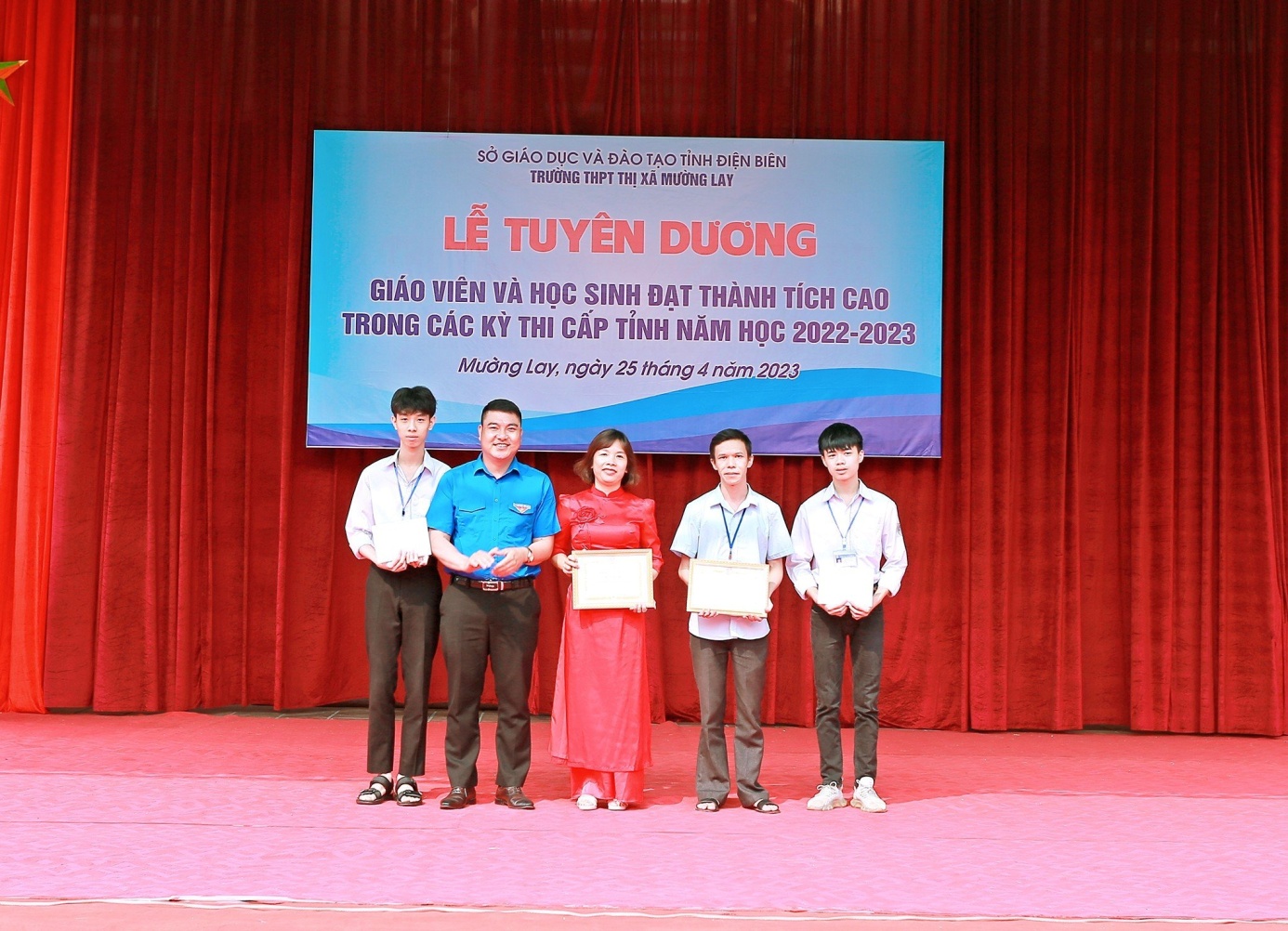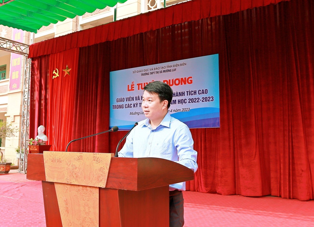 Trong không khí thi đua sôi nổi hướng tới kỷ niệm 60 năm thành lập trường THPT Thị xã Mường Lay (1963 – 2023), nhằm kịp thời biểu dương khen thưởng những học sinh đạt thành tích cao trong kỳ thi chọn học sinh giỏi cấp tỉnh lớp10, 11, cuộc thi IOE cấp tỉnh và giáo viên có thành tích trong bồi dưỡng học sinh giỏi. Sáng ngày 25/4/2023, Trường THPT thị xã Mường Lay long trọng tổ chức “Lễ tuyên dương, khen thưởng giáo viên và học sinh đạt thành tích cao trong các kì thi cấp tỉnh lớp 10,11và cuộc thi IOE cấp tỉnh năm học 2022-2023”.