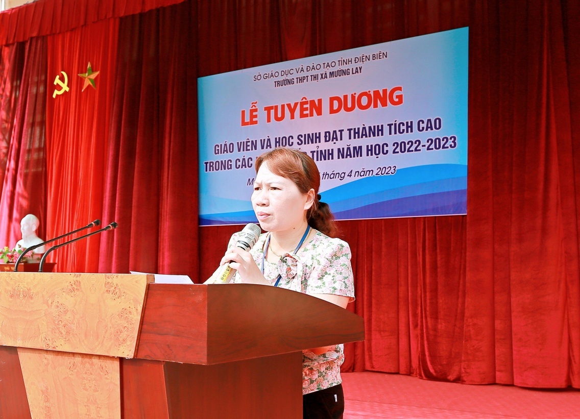Tại buổi Lễ Tuyên dương, em Lò Thị Anh Thơ – học sinh đạt giải ba môn Ngữ văn 10, đã bày tỏ lòng biết ơn đến các thầy cô giáo, chia sẻ về sự nỗ lực cố gắng của bản thân và lời hứa quyết tâm học tập, tiếp tục đạt thành tích cao trong các kỳ thi tới. Thay mặt các thầy cô giáo tham gia bồi dưỡng học sinh giỏi, cô giáo Hoàng Thị Hồng Thảo – Tổ trưởng tổ Sử - Địa - GDCD - GDĐP, với nhiều năm ôn thi, có nhiều học sinh giỏi cấp tỉnh cũng chia sẻ về kinh nghiệm bồi dưỡng học sinh giỏi, chúc mừng các thầy cô và các em học sinh đạt thành tích cao trong kỳ thi, động viên những em học sinh chưa đạt kết quả tốt, tiếp tục cố gắng, rèn luyện, trau dồi kiến thức để đạt thành tích bứt phá trong các kỳ thi sắp tới.