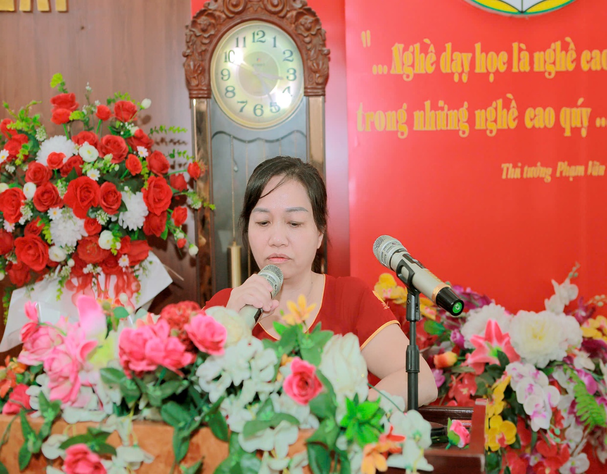 Tiếp theo chương trình, cô Nguyễn Thị Kim Dung, một trong những giáo viên gắn bó lâu năm với trường, đã có bài phát biểu chia sẻ về những thách thức và trải nghiệm của phụ nữ trong nghề giáo. Cô Dung nhấn mạnh rằng, là một người phụ nữ, không chỉ cần làm tốt công việc chuyên môn, mà còn phải đảm đương nhiều trách nhiệm trong gia đình. Tuy vậy, với lòng yêu nghề và sự nhiệt huyết, các cô giáo luôn cố gắng vượt qua mọi khó khăn để mang đến cho học sinh những bài học hay, bổ ích.