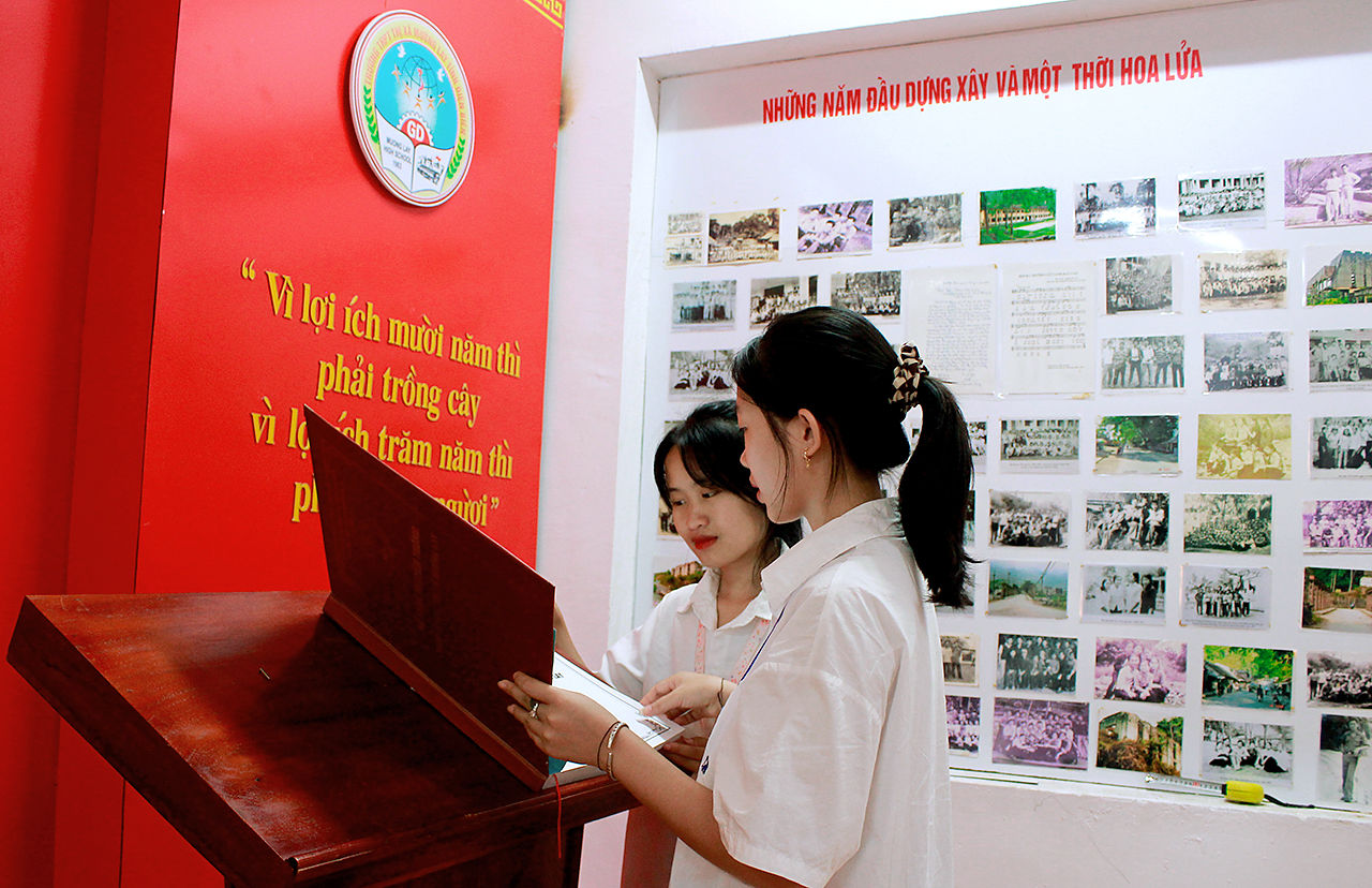 Các em học sinh đang xem những hình ảnh, tư liệu của trường qua 60 năm thành lập