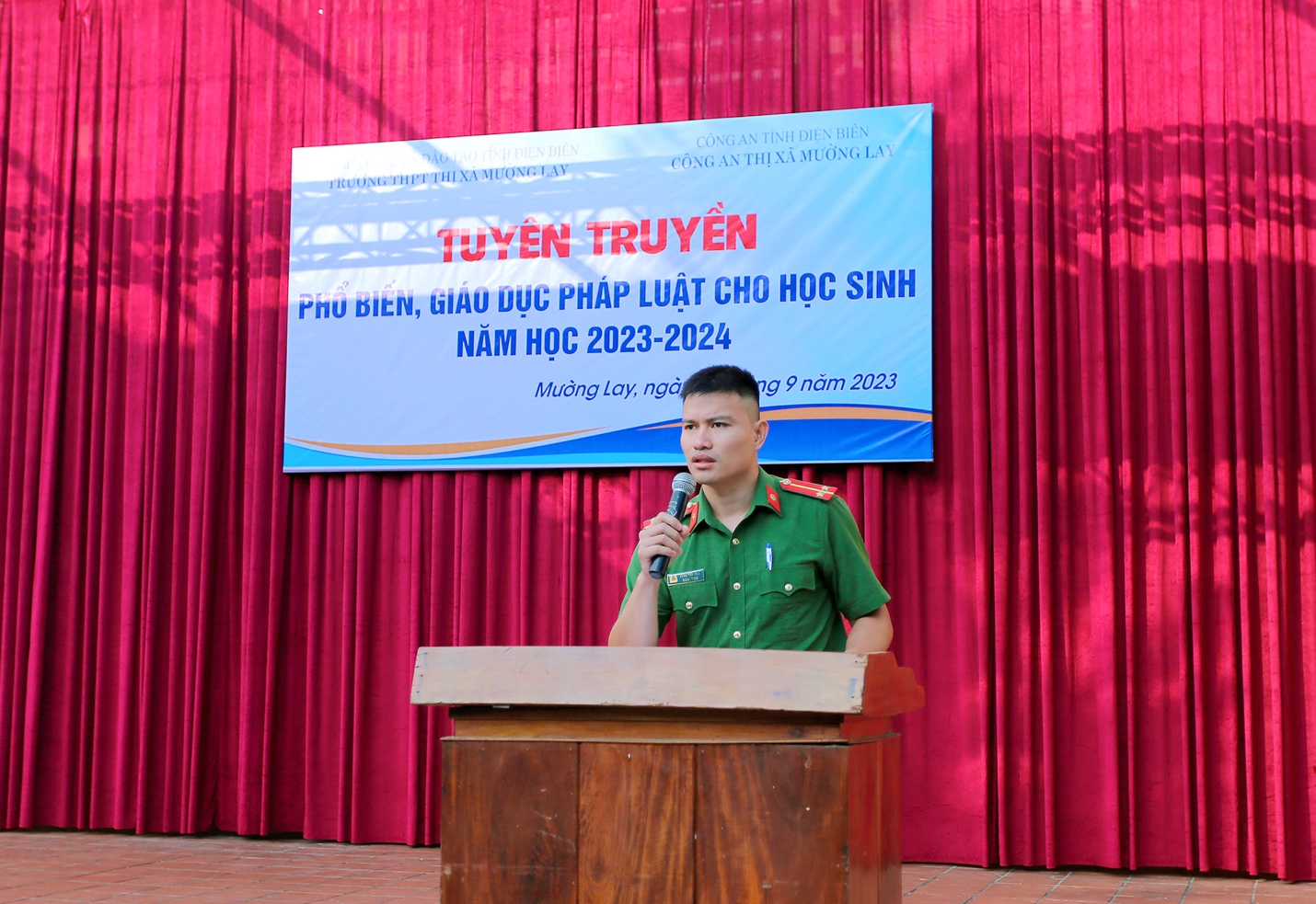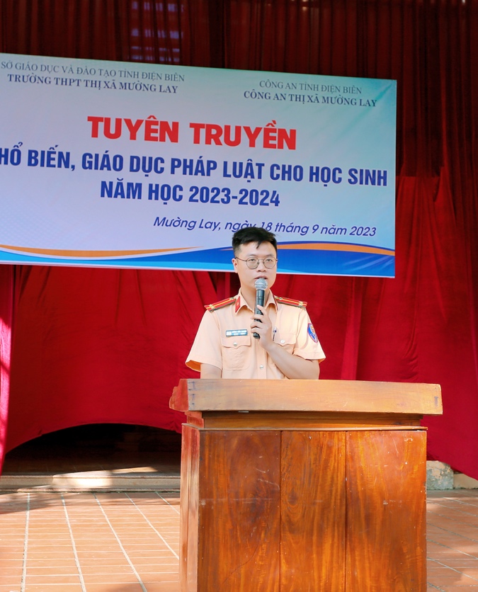 Hình ảnh Trong buổi lễ tuyên truyền Đây là hoạt động nằm trong khuôn khổ Kế hoạch Chương trình phối hợp giữa Bộ Công an với Bộ Giáo dục và Đào tạo giai đoạn 2022 – 2025. Buổi tuyên truyền phổ biến, giáo dục pháp luật về phòng, chống ma túy, tác hại của tệ nạn ma túy và an toàn giao thông cho 670 học sinh trường THPT thị xã Mường Lay được tổ chức vào sáng ngày 18 tháng 9 ngay sau giờ chào cờ tại sân trường. Tham dự chương trình có đồng chí Nguyễn Văn Hải, Bí thư chi bộ, Hiệu trưởng trường THPT thị xã Mường Lay; đại diện Công an thị xã Mường Lay đại úy Lù văn Mười, cán bộ đội CSGT,đại úy Vàng Văn Thịnh cán bộ đội CSGT cùng tập thể cán bộ, giáo viên và học sinh trường THPT thị xã Mường Lay. Tại buổi tuyên truyền, 670 em học sinh trường THPT thị xã Mường Lay đã được Trung uý Vàng Thái Hoà, cán bộ đội CSĐT cung cấp những kiến thức thiết thực, hữu ích về các loại ma tuý; hiểm hoạ ma túy; dấu hiệu nhận biết người sử dụng ma túy; kỹ năng, phương pháp phòng, chống cho bản thân, gia đình và cộng đồng; trách nhiệm của cá nhân, gia đình, trường học, xã hội trong phòng, chống ma túy. Hình ảnh Trung uý Vàng Thái Hoà tuyên truyền về phòng chống ma tuý